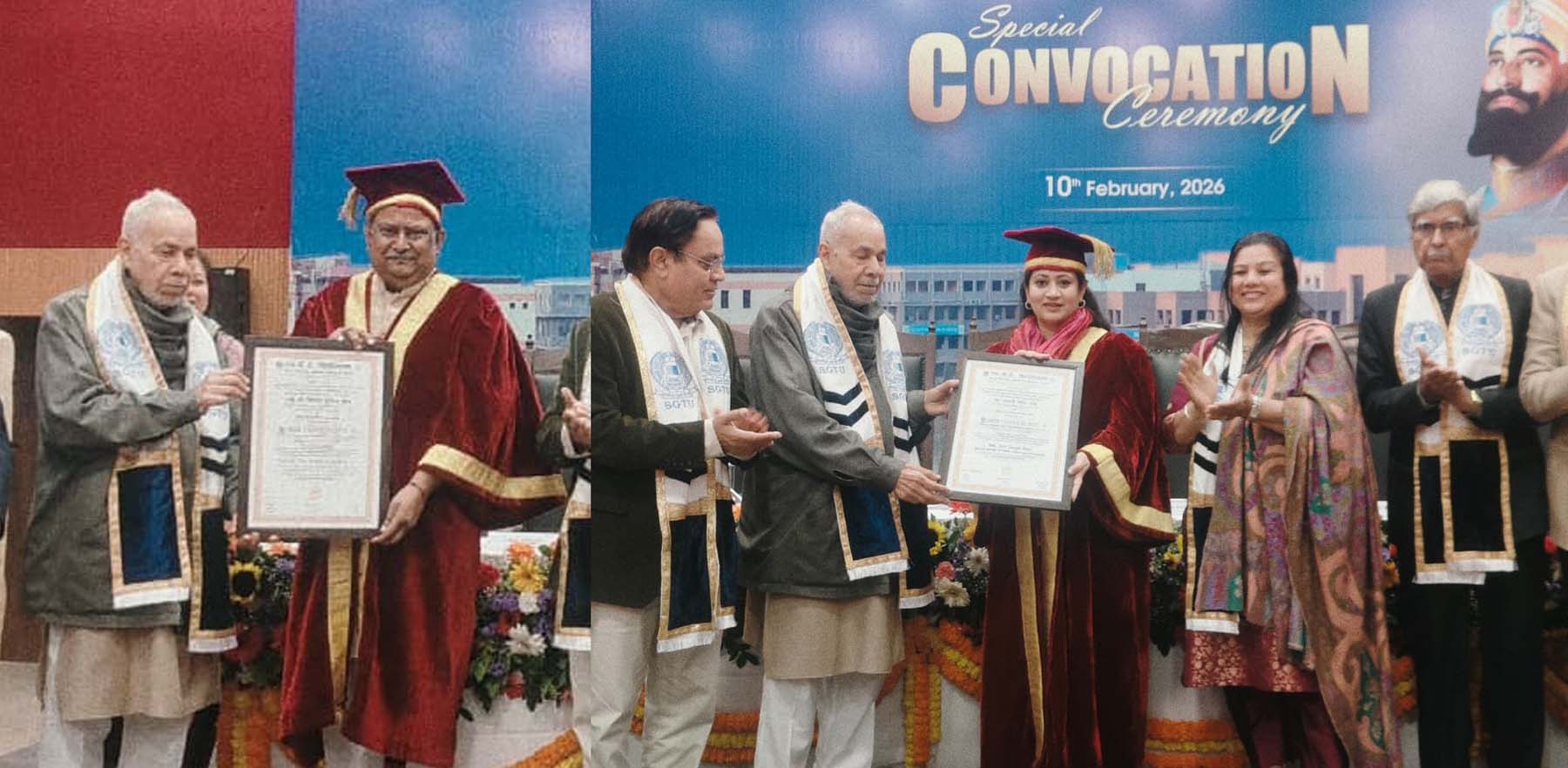 गुरुग्राम, 10 फरवरी । श्री गुरु गोबिंद सिंह ट्राइसेंटेनरी (एसजीटी) विश्वविद्यालय में मंगलवार को आयोजित विशेष दीक्षांत समारोह में प्रदेश की स्वास्थ्य मंत्री आरती सिंह राव तथा प्रख्यात समाजसेवी पद्मश्री बिमल कुमार जैन को डॉक्टर ऑफ लेटर्स (मानद) उपाधि से सम्मानित किया गया। यह सम्मान विश्वविद्यालय की शैक्षणिक परिषद, प्रबंधन मंडल, शासी निकाय एवं कुलाधिपति की अनुशंसा पर प्रदान किया गया। कुलाधिपति राम बहादुर राय ने उन्हें उपाधि भेंट की।