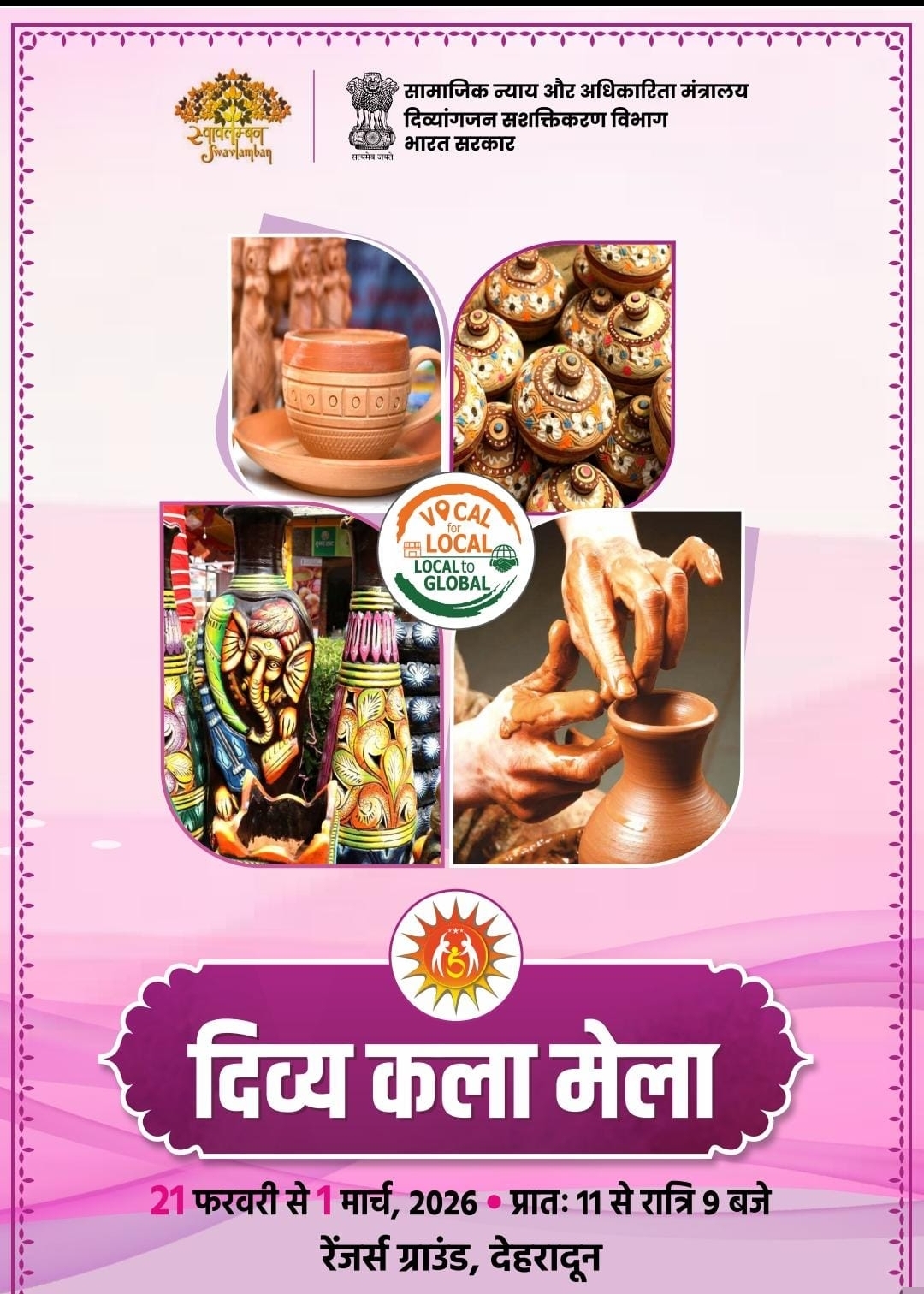 देहरादून, 20 फरवरी । दिव्यांगजन सशक्तिकरण विभाग, सामाजिक न्याय एवं अधिकारिता मंत्रालय की ओर से 21 फरवरी से 01 मार्च-2026 तक देहरादून के रेंजर्स ग्राउंड पर “दिव्य कला मेला” आयोजित किया जाएगा। इस आयोजन की नोडल एजेंसी राष्ट्रीय दिव्यांगजन वित्त एवं विकास निगम है। नौ दिवसीय इस मेले में देश के लगभग 16 राज्यों एवं केंद्र शासित प्रदेशों से करीब 100 दिव्यांग कारीगर, कलाकार और उद्यमी भाग लेंगे। मेले में हस्तशिल्प, हथकरघा उत्पाद, कढ़ाई कार्य, होम डेकोर सामग्री, वस्त्र, स्टेशनरी, पर्यावरण अनुकूल उत्पाद तथा पैकेज्ड एवं ऑर्गेनिक खाद्य सामग्री प्रदर्शित एवं विक्रय के लिए उपलब्ध रहेंगे।