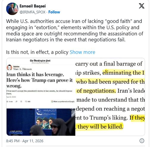 तेहरान, 11 अप्रैल । ईरान ने अमेरिकी मीडिया पर दोहरा रवैया अपनाने का आरोप लगाया है। ईरान के विदेश मंत्रालय के प्रवक्ता इस्माइल बघाई ने कहा कि एक ओर अमेरिका ईरान पर ईमानदारी की कमी का आरोप लगाता है, दूसरी ओर कुछ अमेरिकी मंचों पर ईरानी प्रतिनिधियों के खिलाफ हिंसक बयान सामने आ रहे हैं।