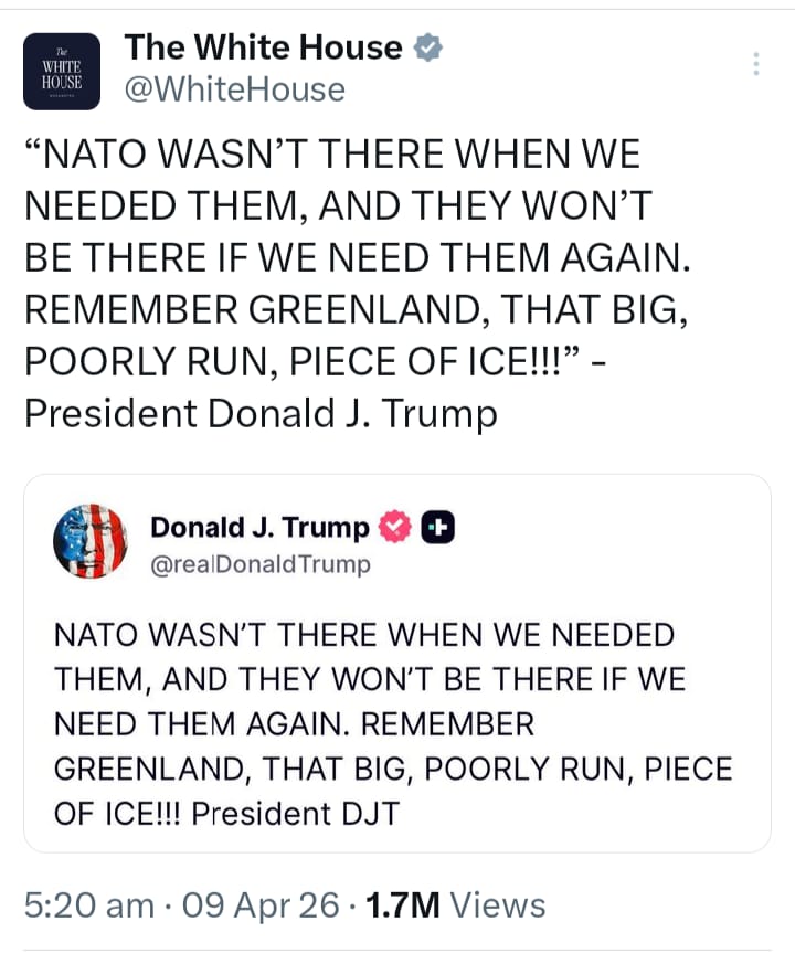 ट्रंप ने ट्रुथ सोशल की एक पोस्ट में लिखा, “जब हमें उनकी जरूरत थी, तब नाटो वहां नहीं था और अगर हमें उनकी दोबारा जरूरत पड़ी तो वे वहां नहीं होंगे।ग्रीनलैंड को याद करो, वह बड़ा, खराब तरीके से चलाया गया, बर्फ का टुकड़ा!!!”